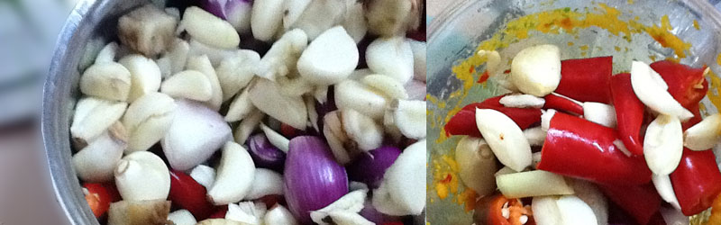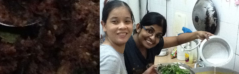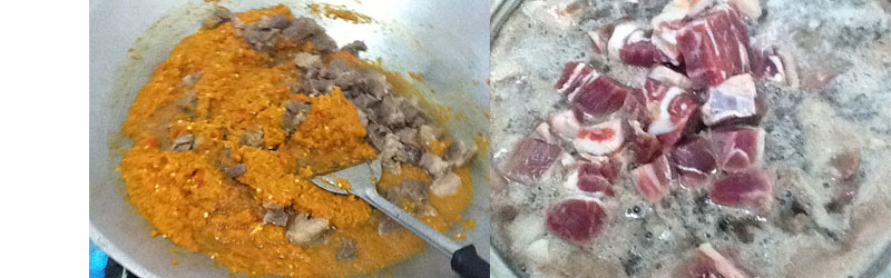 The thing blended and beef meat cooked were done, then we insert the thing blended and a little oil on the skillets or crock. When it has a smell, then insert the beef meat. The last step is pour 1 liter water of coconut (santan), kerisik, and turmeric leaf. Cooking them until dried, no water of coconut but do not make them scorched.